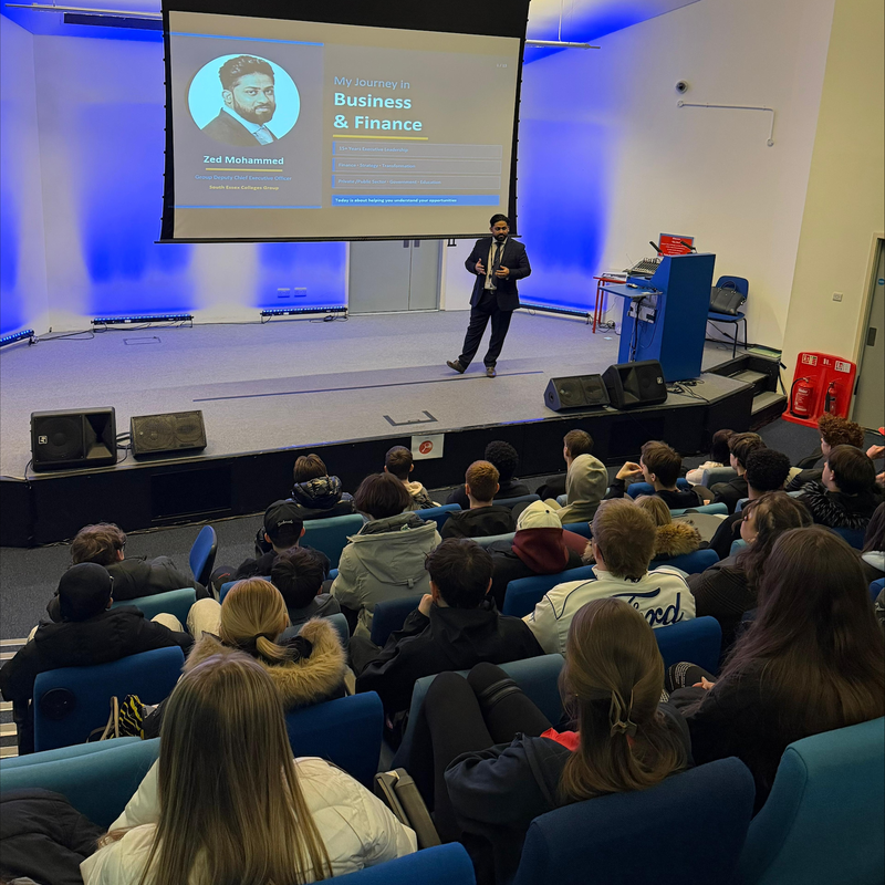 South Essex Colleges Group was delighted to welcome Zed (Zohayb) Mohammed FCCA, Group Deputy Chief Executive Officer, alongside James Willcocks, Head of Management Accounts, for an engaging and inspiring session with our Business and Finance students.